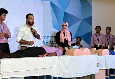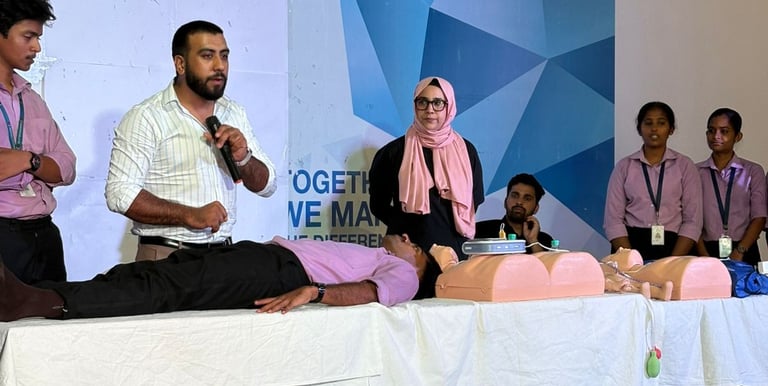 It is a two days Hands on training Programme, simulations for Adult & Infant CPR, AED, Infant and adult choking Managment, Bandaging Techniques and First Aid techniques.